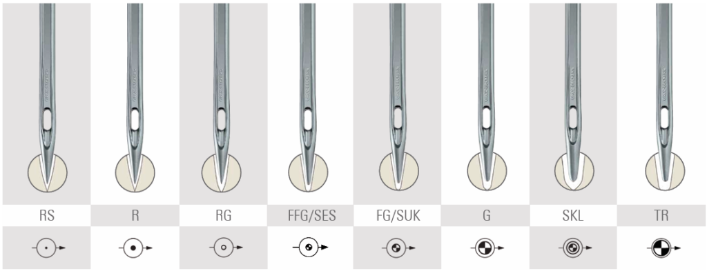 - RS (punta muy aguda): estándar para punto invisible y para costuras de pespunte muy rectas en tejidos finos.