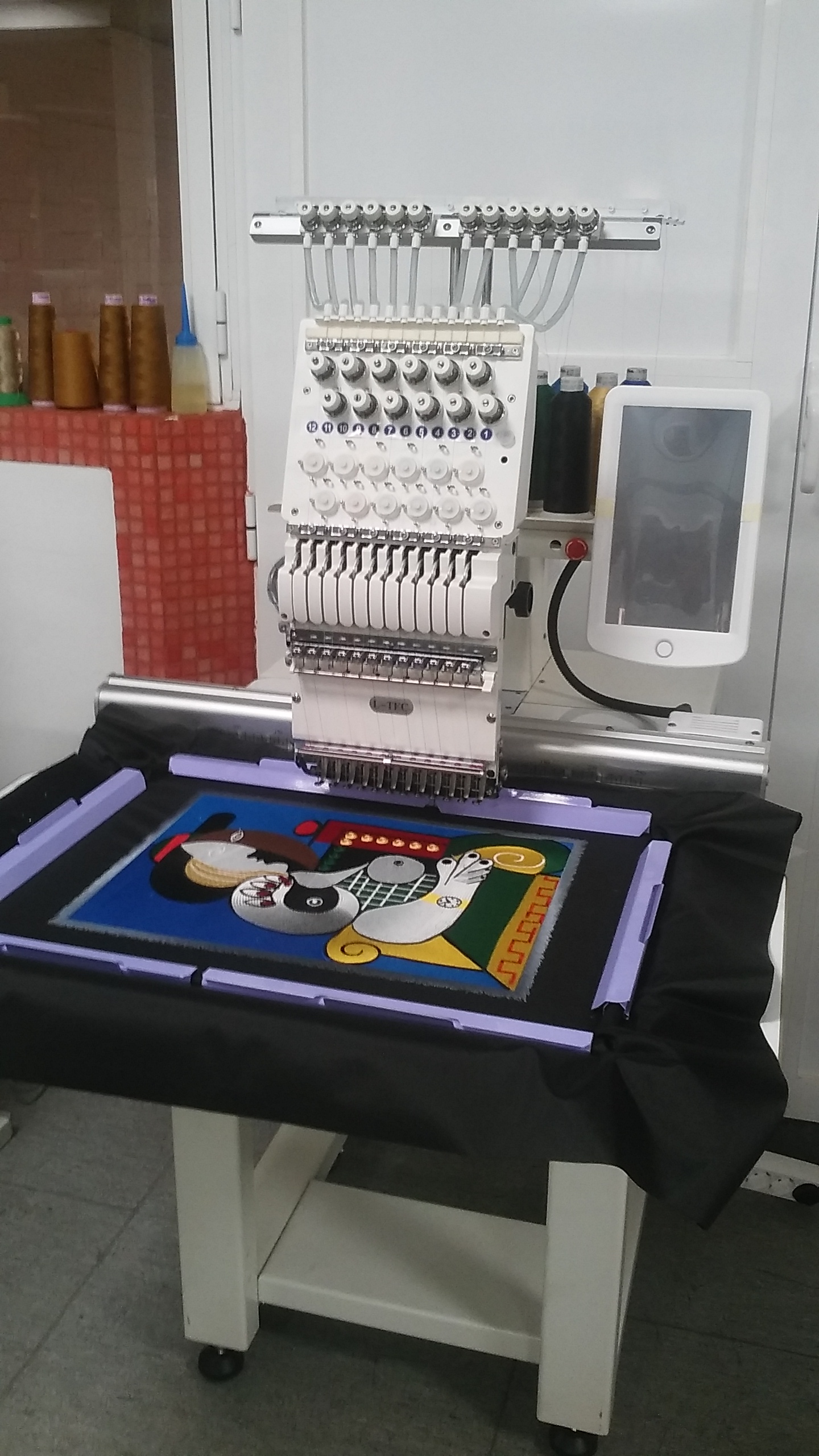 Maquina de bordar de una cabeza, 12agujas, campo de trabajo 250mm x 340 mm.
