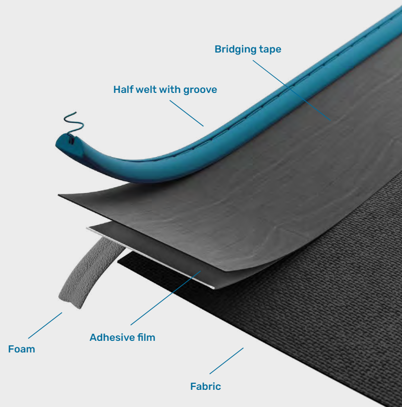 - Con ranura para costura y película adhesiva para unión con PVC.