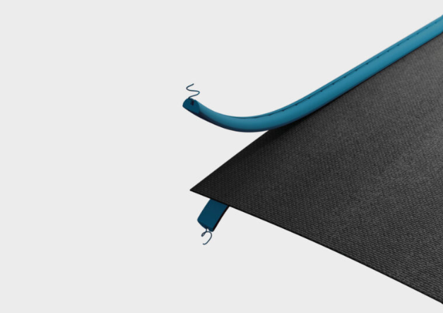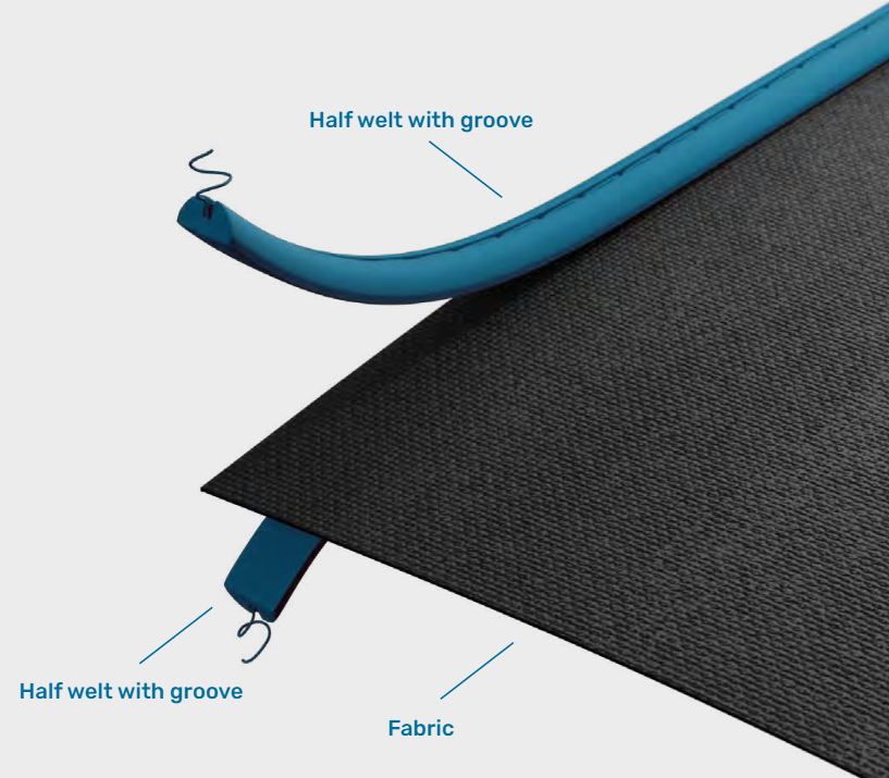 Macarrón de toldos con cosido invisible para el área textil de la protección solar. NonVi Twin consiste en dos medios macarrones con una ranura. El material se posiciona entre ambas mitades y se cose en la ranura.