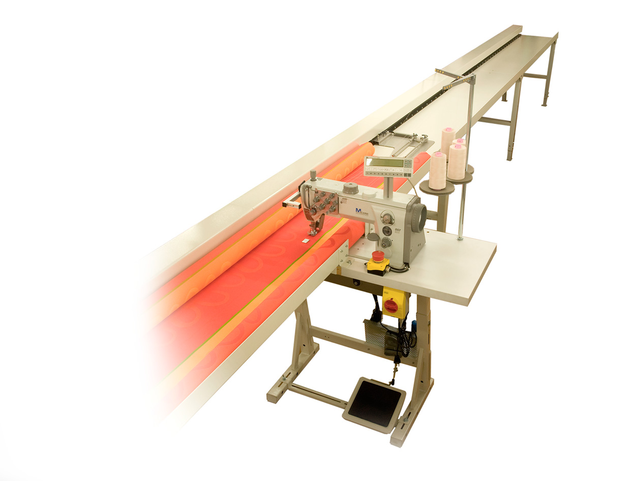 Puesto integrado economizado para unir y dobladillar eficazmente toldos. Mesa de trabajo para posicionar y tensar el material. Transporte continuo del material. Guiado exacto de los cantos del material mediante aparatos y rodillos.